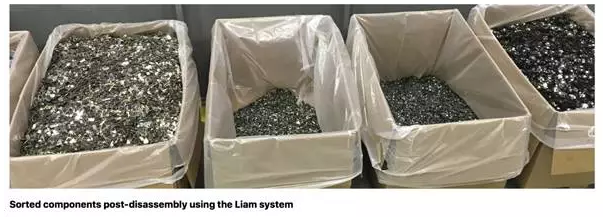 在處理結束時,留給蘋果的是一個個盒子,里面裝著一種組件,比如螺絲、電池。看起來就像下面的圖片一樣: