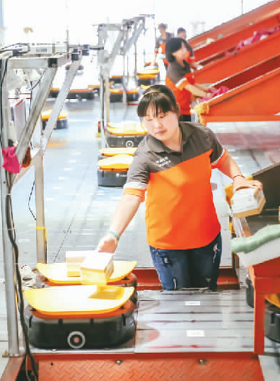 5月3日,一家物流企業(yè)的放件員將包裹放在機(jī)器人的托盤上。