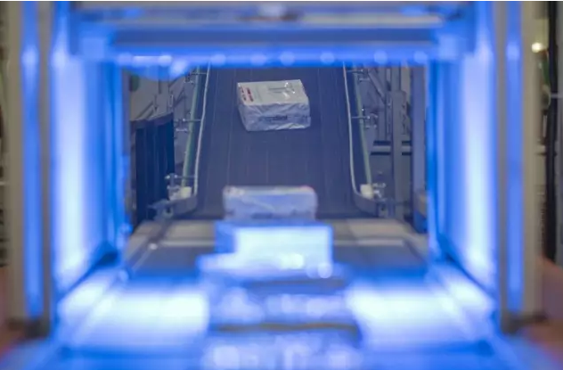 一輛卡車在一個寬闊的車間里倒車, 包裹被卸載后被運到了環形傳送帶上。掃描儀自動讀取條形碼,并按類型、重量和目的地對包裹進行標記。之后,伸縮的金屬臂將包裝從環形傳送帶掃進垃圾箱里。
