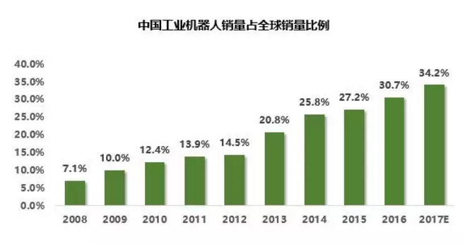 中國的工業(yè)機(jī)器人銷量占全球銷量比例每年都在增加,從2013年開始,這一比例超過20%,預(yù)計(jì)2017年占比將達(dá)到34.2%,隨著國內(nèi)工業(yè)機(jī)器人需求量的增加以及國產(chǎn)品牌的崛起,未來幾年這一較高的比例將繼續(xù)維持。