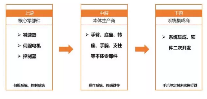 產(chǎn)業(yè)鏈方面,工業(yè)機(jī)器人行業(yè)按產(chǎn)業(yè)鏈分為上游、中游和下游。上游生產(chǎn)核心零部件:包括減速器、伺服系統(tǒng)、控制器;中游是本體生產(chǎn)商,包括工業(yè)機(jī)器人本體。下游是系統(tǒng)集成商,包括單項(xiàng)系統(tǒng)集成商、綜合系統(tǒng)集成商。
