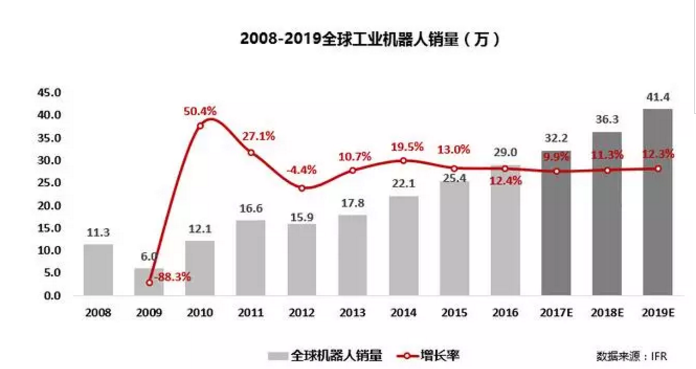 首先從全球來看,2014年開始全球制造業(yè)轉(zhuǎn)型升級(jí),工業(yè)機(jī)器人需求明顯增多,當(dāng)年增長率達(dá)到19.5%。到了2016年仍按保持高速增長,全球工業(yè)機(jī)器人銷量約29萬臺(tái),同比增長12.4%。預(yù)計(jì)2017年全球工業(yè)機(jī)器人銷量為32.2萬臺(tái),2019年將達(dá)到41.4萬臺(tái)。