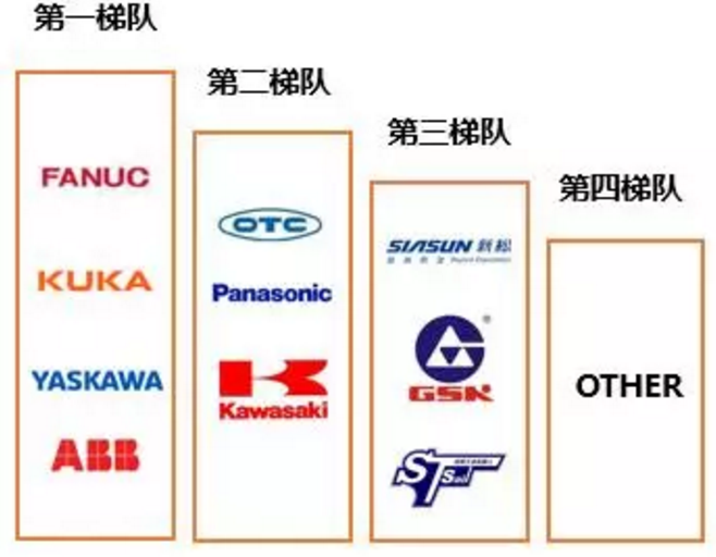 如果把目前市場(chǎng)分成四個(gè)體隊(duì),那第一梯隊(duì)毫無疑問為機(jī)器人四大家族,第二梯隊(duì)為歐地希、松下、川崎重工等老牌企業(yè),第三梯隊(duì)為新松、廣州數(shù)控、廣州起凡等國內(nèi)較為知名的機(jī)器人廠商。