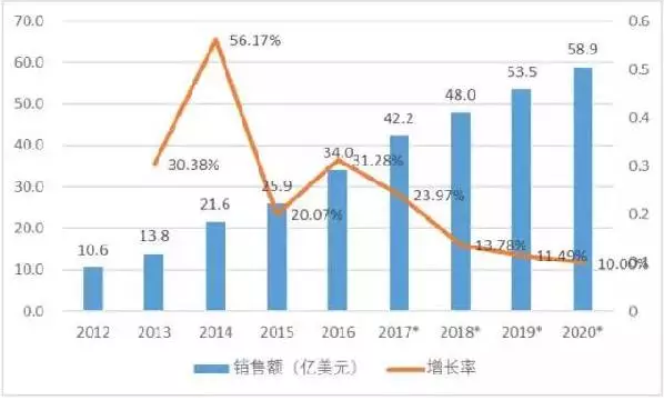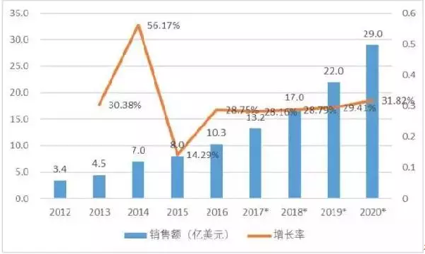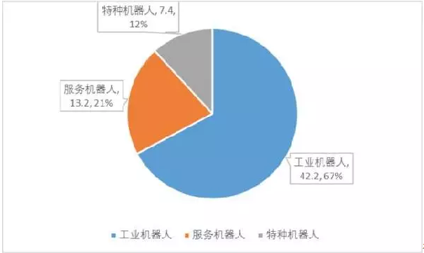 2017年,預計我國機器人市場規模將達到62.8億美元,2012-2017年的平均增長率達到28%。其中,工業機器人42.2億美元,服務機器人13.2億美元,特種機器人7.4億美元。