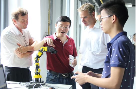 上圖為王光能先生(左二)為德國高校代表演示大族機器人Cute