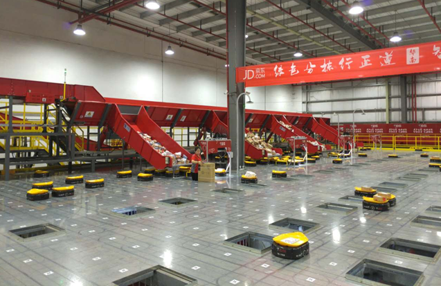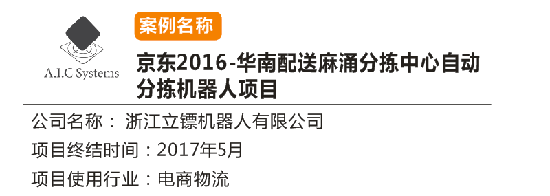 京東2016-華南配送麻涌分揀中心自動分揀機器人項目是立鏢機器人與京東物流首度合作,推廣應用智能快遞分揀機器人。