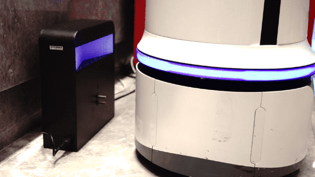 第五步,自動充電。外賣機(jī)器人充一次店就能工作8小時,關(guān)鍵是到警戒電量會自己去充電。