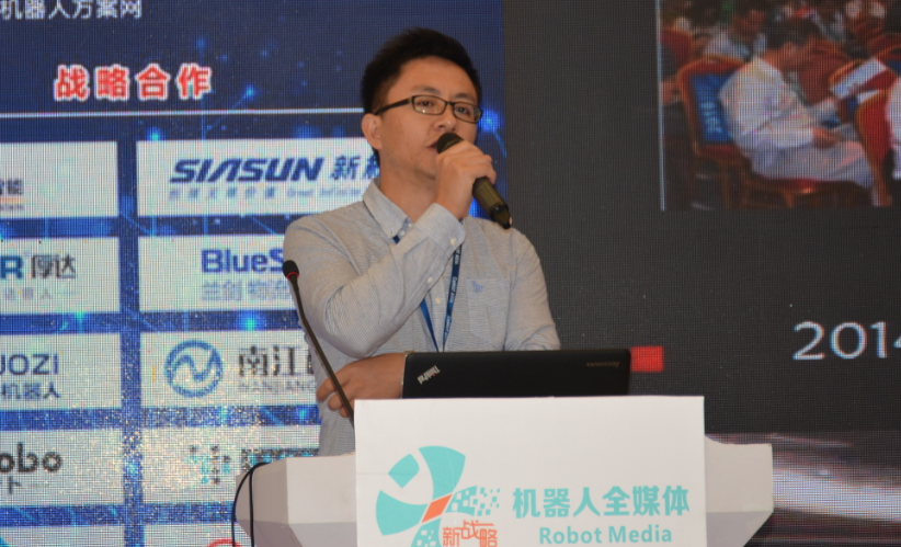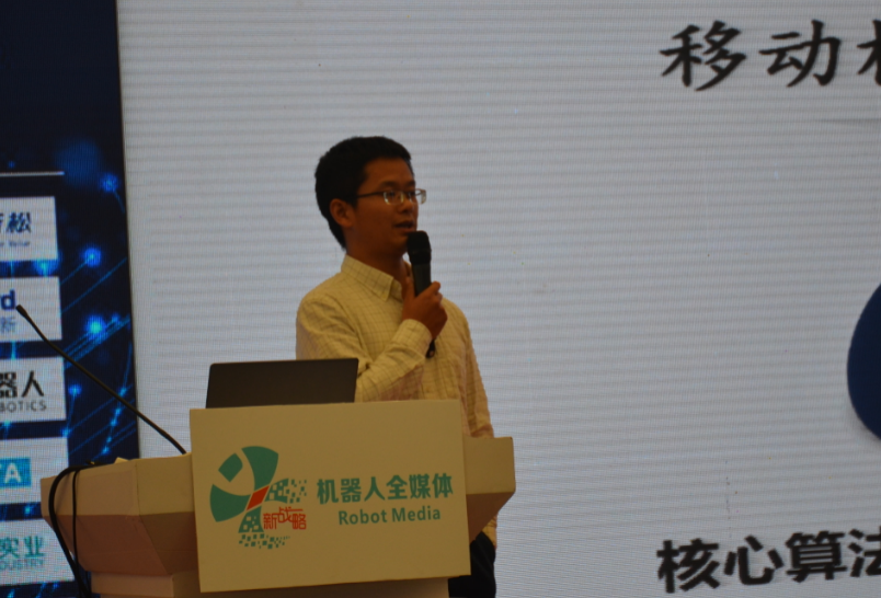圖:會議的冠名商—深圳市鐳神智能系統有限公司銷售總監高忠軍先生發表致辭。鐳神智能的主營產品是激光雷達,其高精度的SLAM導航方案,能夠為AGV等移動機器人產品提供建圖定位信息并實現精確的路徑規劃導航,目前已有量產應用。