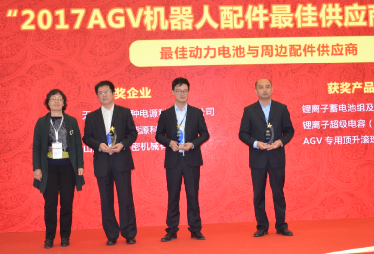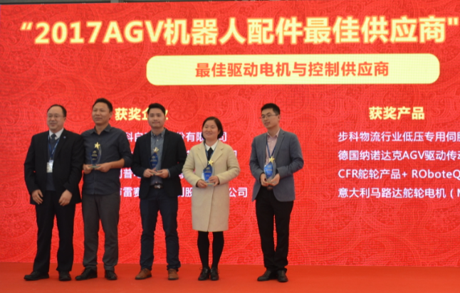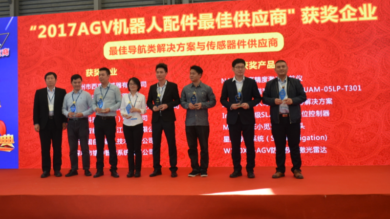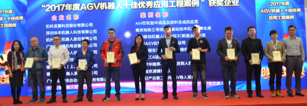 圖:《2017年度AGV機器人配件最佳供應商》頒獎典禮現場,頒獎嘉賓為沈陽新松機器人自動化股份有限公司高級副總裁王宏玉先生、北京機科發展科技股份有限公司副總經理金亞萍女士、云南昆船智能裝備有限公司總經理姜榮奇先生。(獲獎企業:西克、湘聚實業、速感科技、輕客智能、浙江國自、鐳神智能、木牛流馬、同普電力、上海步科、浩洋自動化、雷賽智能、天津力神、展梟新能源、理工精密)