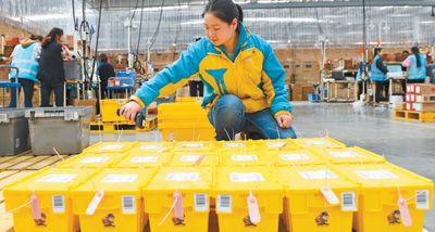 記者在蘇寧南京物流基地看到,常見的包裝紙箱被堆到一邊,工人們忙著搬運 一種黃色的共享快遞盒,它有中等紙箱大小,易于收納和碼放,更不必擔心壓壞箱內物品。