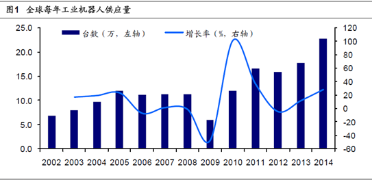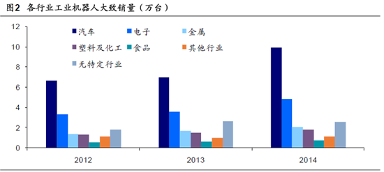 中國3C 行業制造能力強,而自動化需求逐漸提升。根據工信部2014 年電子信息產業統計公報,中國主要電子信息產品產量穩步增長。2014 年,我國共生產手機、微型計算機和彩色電視機16.3 億部、3.5 億臺和1.4 億臺,分別增長6.8%、-0.8%和10.9%,占全球出貨量比重均達半數以上。但中國3C 行業的發展離不開較低的人力成本和較高的工作效率的貢獻,未來自動化需求將不斷提升。尤其是目前國內多家手機行業的制造商均計劃或已開始在人力成本更低的印度、巴西等國建廠。機器人和自動化將成為行業持續發展和應對人力資本提升的重要出路。