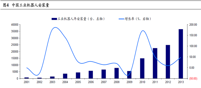 中國工業機器人行業分類與世界情況相似,汽車和電子行業的工業機器人應用最多。自2010 年到2013 年,汽車行業工業機器人安裝量從7400 臺增加至14200 臺,電子行業的工業機器人安裝量從2027 增加至6725 臺。電子行業的工業機器人數量及比例逐漸提升,體現了行業的自動化需求的提升。但汽車行業工業機器人技術較為成熟,且多被四大家族(ABB、發那科、安川、庫卡)所占據,國內公司進入存在較大的困難。而電子行業機器人雖然數量眾多,但大部分仍屬于簡單的桌面橫縱坐標軸機器人,Scara、Delta、六軸、七軸機器人的發展空間很大,國內廠商有彎道超車的機會。