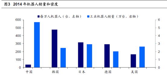 中國工業機器人發展迅速,但單位工人擁有機器人數量很低,未來發展空間巨大。中國的工業機器人在經歷了良好的開局和增長后,將繼續迎接輝煌時期。2009 至2014年,中國工業機器人市場銷量以年均58.9%的速度增長,2014 年中國工業機器人市場銷量超過5.6 萬臺,約占全球市場的1/4,是全球第一大工業機器人市場。但是中國每萬名工人的機器人擁有量卻遠低于美德日韓等國家。從實際細節來看,要提升機器人的密度,必然要改善我國的工業勞動關系(提高科技,降低低廉人力資本的使用)、協調各工業行業共同發展,從結果和宏觀上來看,可工業機器人的密度可以從保有量的提升中反映出來。2015 年中國工業機器人保有量約為40 萬臺。根據《中國制造2025》機器人領域的路線圖:2020 年,我國工業機器人年銷量將達到15 萬臺,保有量達到80 萬臺;到2025 年,工業機器人年銷量將達26 萬臺,保有量達180 萬臺。2016-2020 年中國工業機器人的復合增長率為14.9%,平均年凈增加量達8 萬臺。隨著智能制造的推進,中國的工業機器人密度會隨著機器人保有量的增加而不斷接近和趕上發達國家水平。