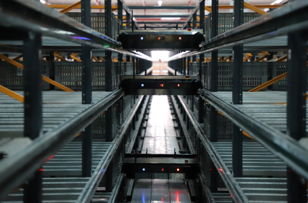 2)輸送線按照系統指令將料箱輸送到對應的提升機入口,提升機將料箱送至對應的巷道,最后由智能高速巷道穿梭車將料箱放置到相應貨位。