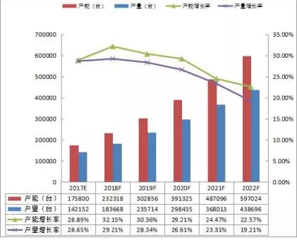 全球2017-2022年3C智能機器人產能(臺)、產量(臺)及增長率