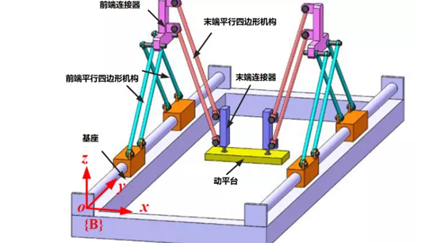 中國科學院寧波材料技術與工程研究所先進制造技術研究所精密運動與先進機器人團隊最新設計的四自由度并聯機器人,可以實現3T1R四個自由度的運動,是少自由度并聯機器人的創新設計之一,其主要特點為2條相同支鏈通過被動轉動副連接到動平臺上,且每條支鏈有2個相同分支通過安裝在基座上的移動副作為驅動。為進一步分析機構特點,采用螺旋理論驗證了該機構自由度的數目及機構的運動學特性,得到了其位置的封閉解,根據機構的運動學特性和構型特點,該機構位置正解的封閉解最多有8組解,位置反解最多有4組解,結果表明,運動學分析簡單是此并聯機器人的特點之一。此外,具有構型對稱、工作空間大、速度快且定位精度高的特點。相比于傳統的并聯機器人而言,它能夠實現XYZ三個方向的運動與一個繞Z軸方向的轉動,且在驅動方向工作空間可依作業需求擴展,增大了工作空間的范圍。