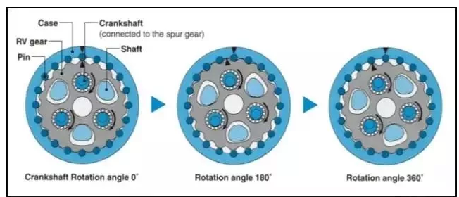 在外殼的內(nèi)環(huán)圈內(nèi)裝有圓柱形的滾針,RV齒輪的偏心運動引起滾針與擺線形RV輪齒的嚙合和脫離,產(chǎn)生多組RV輪齒與滾針同時嚙合,提高負載能力。 由于RV齒數(shù)比滾針少1個數(shù)目,因此當偏心軸旋轉(zhuǎn)一周時,如果固定外殼 (case),則RV齒輪與輸入軸同向轉(zhuǎn)1個齒的角度。