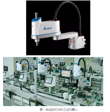 臺達研發出的SCARA工業機器人可廣泛應用在消費性電子產品、電子電機、橡塑料、包裝、金屬制品業的電鎖、組裝、涂膠、移載、焊錫、搬運、包裝等應用領域,輕松簡易地結合外圍整合控制開發系統,進而打造出精簡、高整合性的機器人工作站。