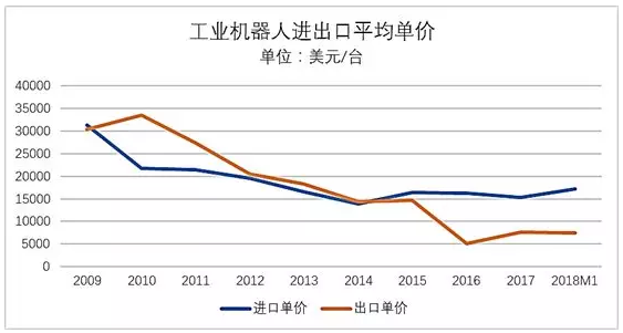 1月份,我國工業機器人進出口單價分別為17000和7400美元/臺,進口單價較2017年平均水平上升13%,出口單價略有下降,幅度不大。