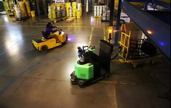 北卡羅來納州中心已經實現高度自動化,超過80%的包裹通過傳送帶、掃描儀和不需要人工勞動的分類器系統進行自動分揀。當一輛裝滿包裹的卡車到達時,工人們將笨重的物品裝上與機器人連接的拖車上。一旦這些拖車滿了,他們就按下一個按鈕,就會把拖車送過去。機器人配備了激光傳感器、照相機和其他導航工具,當人們或其他車輛擋道時,機器人就會停下來。在某些情況下,它們甚至會選擇其他路線行進