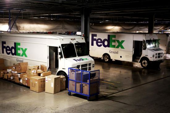 圖:在北卡羅來那州的一個配送中心,聯邦快遞的卡車旁有各種大小的箱子