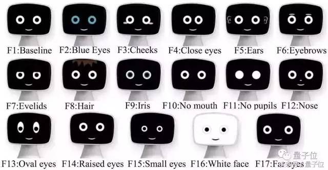 在下圖中有17張相似的機器人臉,在F1這張基準圖的基礎(chǔ)上,研究人員對面部進行微調(diào)。