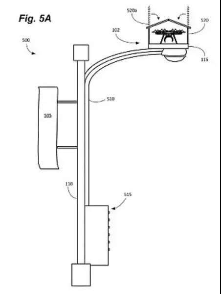 亞馬遜還設(shè)計(jì)了一款跟路燈結(jié)合在一起的無(wú)人機(jī)投遞臺(tái)。