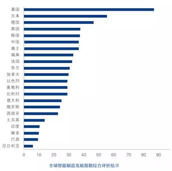 該報告篩選出22個樣本國家,評價結果顯示,美國、日本和德國名列第一梯隊,是智能制造發展的“引領型”國家;英國、韓國、中國、瑞士、瑞典、法國、芬蘭、加拿大和以色列名列第二梯隊,是智能制造發展的“先進型”國家。