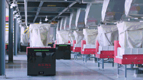 在出庫區(qū)域,300多個最小型“小紅人”AGV負責將每個小包裹按照訂單地址投放入不同的轉(zhuǎn)運包裹中,中型AGV完成第二輪分配和打包,大型AGV則直接把最后要送往京東終端配送站點的大包裹送上傳送帶。而傳送帶可以直接從庫房內(nèi)延伸至庫房外的運輸車上。
