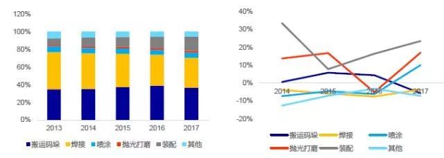 2013-2017 年中國工業(yè)機(jī)器人應(yīng)用工藝分布