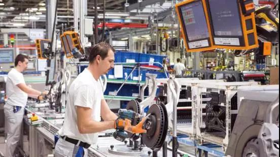 大眾集團總部所在地狼堡的大眾車間裝配線一角,一位一線德國女工和她的工友們正在安裝儀表盤等汽車內部組件的流水線上忙碌,和她一起協同忙碌的還有她身邊一只巨大的機器人手,機器人手熟門熟路地伸進車窗,短短幾分鐘里就行云流水般地將儀表盤安裝妥當。在這里,有了機器人的輔助,工人完全可以停下來聽會音樂,放松自己,甚至能和記者攀談一會。