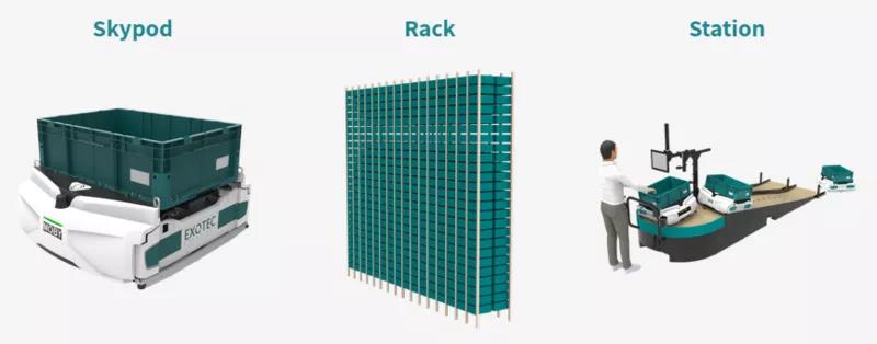 同時,Exotec致力于通過三維移動機器人和配套設(shè)施,為電商和零售行業(yè)打造全自動化的倉儲系統(tǒng)。整個系統(tǒng)由三個主要模塊組成:倉儲機器人Skypod、貨架、站點。