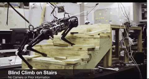 這只大小相似成年拉布拉多犬的90磅重的機械野獸,是故意被設計成不依賴相機或任何外部環境傳感器而完成這些動作的。取而代之的是,它通過敏捷地“感覺”周圍環境的方式來行動,工程師們稱之為“盲目運動”,就像穿過一個漆黑的房間一樣。