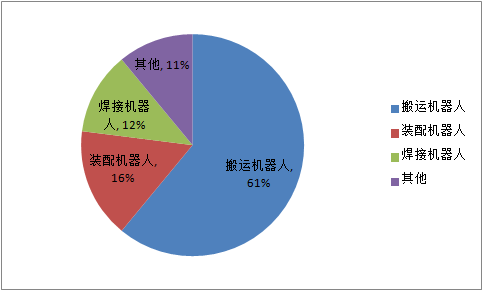 具體到機器人產業的各個應用場景,在全球工業機器人市場,搬運機器人銷量最高,規模達到94.5億美元,占比最高,達61%,其次為裝配機器人,占比16%,高于焊接機器人占比4個百分點。