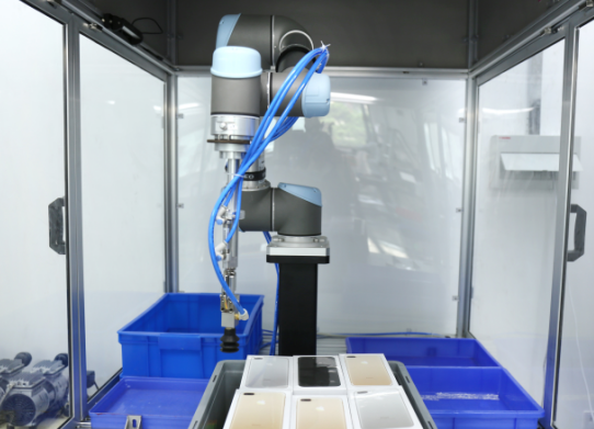 4、 UR機(jī)器人根據(jù)貨品的種類,將貨品放置到特定的料箱中。