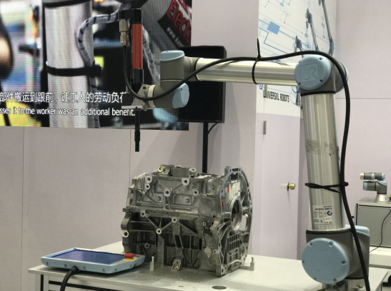 UR機(jī)器人由于體積小、部署靈活的特點(diǎn)可以非常方便的安裝在現(xiàn)場,只需占用一名作業(yè)員站立的空間。并且由于UR機(jī)器人自帶安全保護(hù)功能,不需要外加防護(hù)欄,機(jī)器人本體碰撞到人會自動停止,完美解決了工廠空間有限,設(shè)備部署緊湊問題。UR機(jī)器人六關(guān)節(jié)的超高自由度,工作空間是一個完整的球體,可以滿足發(fā)動機(jī)在各個方向擰緊螺絲的需求。UR機(jī)器人替代人工,承受住擰緊槍巨大的反作用力,大大減少了人工操作時,需要承受的過渡勞力。
