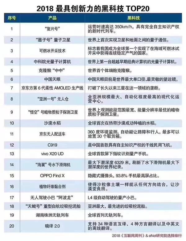 該榜單由中科院主管的《互聯網周刊》和eNet研究院聯合發布。在榜單中,京東物流無人倉、配送機器人與復興號、“墨子號”量子衛星、中國天眼、中科院光量子計算機這些展現中國科技實力和專業水準的黑科技共同入選,成為中國科技領域最耀眼的國家名片。