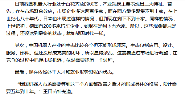 機器人行業(yè)發(fā)展最核心的關(guān)鍵點是人才。與其他傳統(tǒng)行業(yè)不同,機器人是依靠研發(fā)積累和科技創(chuàng)新才能取勝的行業(yè),所以人才是根本。北京航空航天大學(xué)教授王田苗說:“這方面美國做的非常好,我國目前也非常重視,已經(jīng)出臺了相關(guān)人才的政策。”
