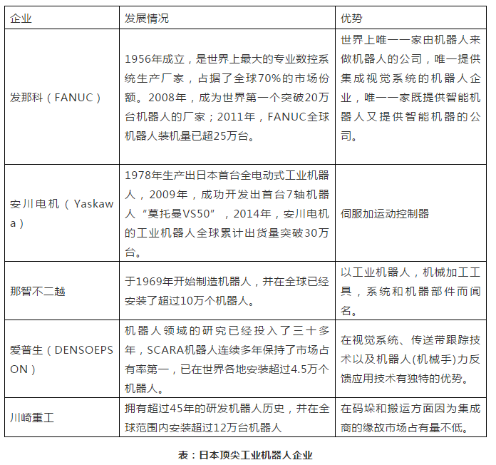 根據(jù)2017年數(shù)據(jù)顯示,在工業(yè)機(jī)器人領(lǐng)域,全球前十大機(jī)器人廠商瓜分了90%的市場。而這之中,日本企業(yè)有五家,分別是:發(fā)那科、安川、那智不二越、愛普生以及川崎。可謂占據(jù)了半壁江山。