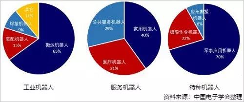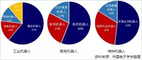 我國工業機器人市場規模達到36.3億美元,搬運機器人占比最高,達65%,其次為裝配機器人,占比15%,比焊接機器人占比高出6個百分點。服務機器人市場規模達到11.3億美元。其中,家用服務機器人、醫療服務機器人和公共服務機器人市場規模分別為4.5億美元、3.5億美元和3.3億美元。特種機器人市場規模達到6.5億美元,其中,軍事應用機器人、極限作業機器人和應急救援機器人市場規模分別為4.5億美元1.4億美元和0.5億美元。