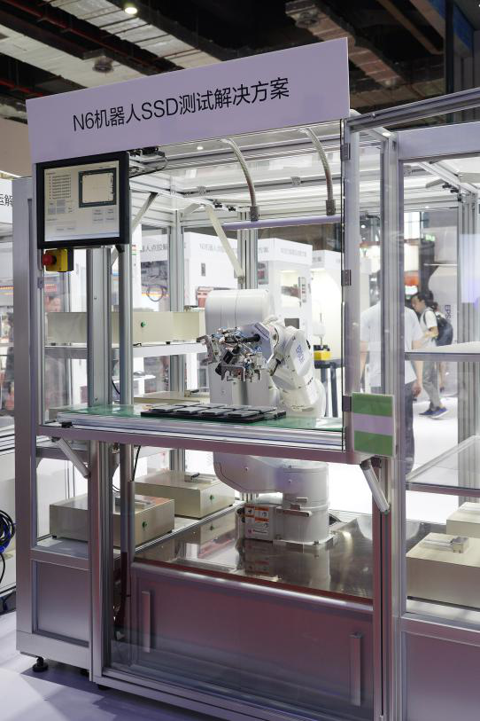 最近發布的“無所不至”新型折疊手臂六軸機器人N6(以下簡稱:N6機器人)首先映入眼球。現場展示的N6機器人 SSD測試解決方案,由N6機器人搭載愛普生中空壓力傳感器,完美演繹了N6機器人的球形手臂優勢,在高速靈巧的活動范圍下,負載也進一步提升,可應用于更多元的產業中,同時提高生產力,也可處理多個測試站。N6作為一款擁有較高性價比和易用性的機器人,可廣泛應用于3C電子、汽車電子、醫療等行業中,因其采用的折疊手臂式結構和內部走線的設計,N6機器人可自然進入高層設備、機器、架子等狹窄空間,方便架設與示教,輕松滿足制作商對提高制作精度的需求,保證在提高生產率的前提下有效節約安裝空間。