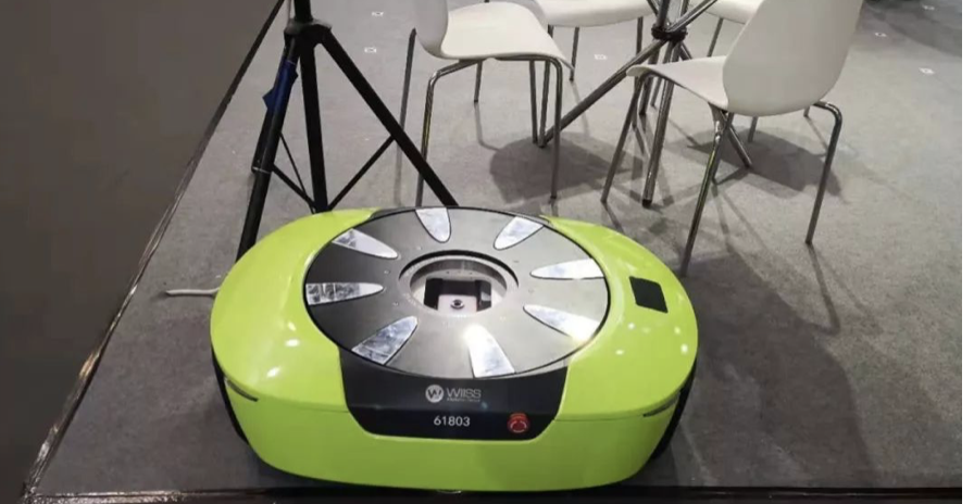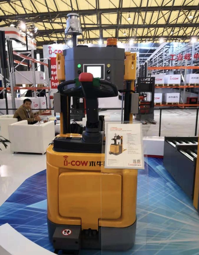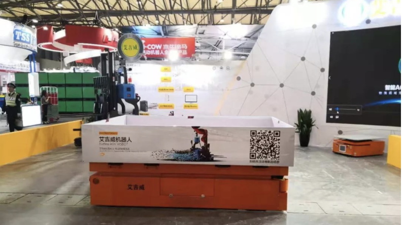 艾吉威此次帶來的是無標識激光背負式AGV,雙舵輪全伺服驅動,可全向移動。