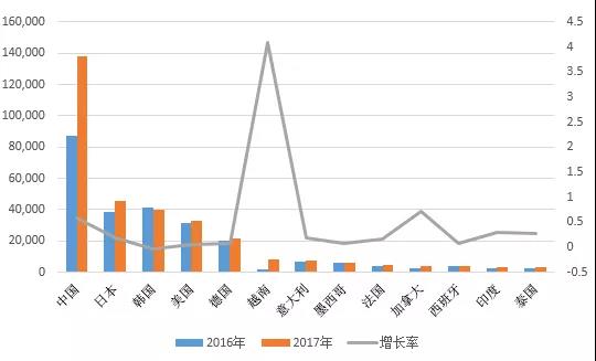 2017年全球各國工業機器人銷量排名