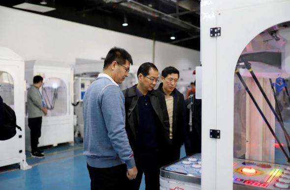 在今年的11月,鎮江經開區管委會常務副主任邵兵帶隊,會同鎮江市商務局來訪勃肯特實地考察,勃肯特董事長王岳超帶領考察人員依次參觀了勃肯特機器人展廳、精加工中心以及智慧裝配工廠,并在會議上與來訪人員暢談了勃肯特智能工廠項目,得到了大家的一致認可與好評。