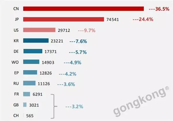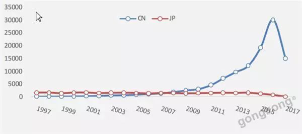 從時間跨度上來看,中國在2006年前后的專利申請量超過日本,居世界首位。