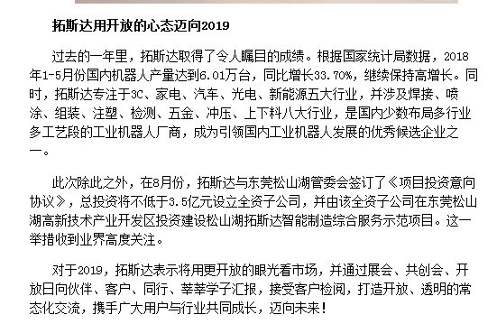 廣東拓斯達科技股份有限公司(簡稱:拓斯達)是國內知名的專注于工業機器人集研發、制造、銷售于一體的企業,其核心產品包括以工業機器人為代表的智能裝備,以控制系統及MES為代表的工業物聯網軟件,為客戶提供基于工業機器人的智能生產環境整體解決方案,只為打造健康的智能制造生態圈。發展至今,拓斯達已經成為國內工業機器人行業的領軍品牌之一。在過去的2018年里,拓斯達業績再創新高,業績增長成為同行業的佼佼者之一。