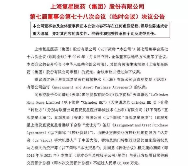 近日,達芬奇手術機器人的中國獨家代理商上海復星醫藥(集團)股份有限公司發布公告稱,以不超過6億元人民幣對達芬奇手術機器人中國代理權進行轉讓,受讓方為聯營公司直觀復星上海和直觀復星香港。這兩家公司復星醫藥均只持有40%股份,不再有控股權,控股權由美國直觀醫療器械公司間接掌握。
