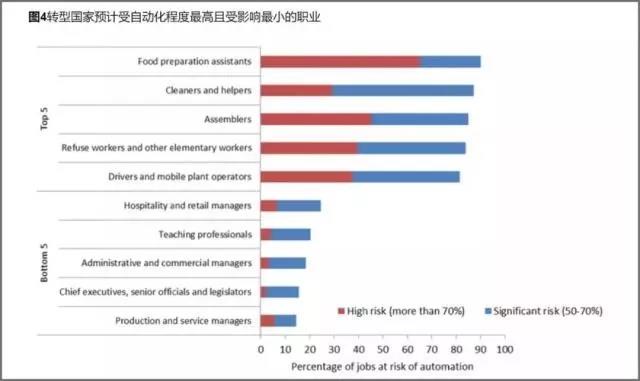 在工業化的過渡地區,有幾個工種還是要有心理準備。包括食品準備助理、清潔工、幫工、裝配工,垃圾工人、司機和手機工廠操作員等職業面臨著最高的自動化風險(圖4)。需要大量分析技能和/或高水平與社會互動的職業,如經理、專業人士和高級管理人員。這些最不可能實現自動化的職業在面對工業機器人的挑戰時,可以高枕無憂。