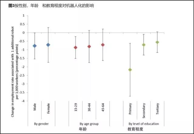 在2010年至2016年間,只有13%的就業率下降歸因于機器人普及化。換句話說,大部分就業率總體下降的原因用機器人搶了人類工作這個因素是解釋不了的。在機器人普及化影響方面,男性和女性之間或年輕和老年工人之間沒有統計學上的顯著差異。所以不能斷言機器人搶了男人工作,女人工作,或者搶了老年人、工作經驗不足的年輕人的工作。然而,也許并不奇怪,就目前暴露出來的機器人對人的影響中,對教育水平相對較低的人來說影響最大(圖3)。但是,隨著技術的發展,情況很可能會發生變化。
