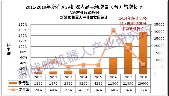 2018年AGV機器人無論從產(chǎn)業(yè)規(guī)模還是產(chǎn)品銷量都實現(xiàn)穩(wěn)定增長,據(jù)中國移動機器人(AGV)產(chǎn)業(yè)聯(lián)盟、新戰(zhàn)略機器人產(chǎn)業(yè)研究所的數(shù)據(jù)調(diào)研,2018年中國市場AGV機器人相關產(chǎn)品市場新增量較2017年實現(xiàn)42.5%的增長,2018年中國市場新增移動機器人(AGV)29600臺,其中包含普通AGV、AGC、叉車AGV、電商倉儲物流AGV、停車以及戶外重載AGV等,市場規(guī)模達到42.5億元。
